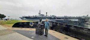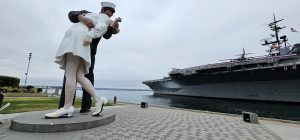 Gemi önünde meydanda ; Alfred Eisenstaedt‘in 1945 yılında New York, Time Square’de bir denizcinin bir hemşireyi öptüğünü gösteren fotoğrafından esinlenerek yapılmış “Koşulsuz Teslimiyet” heykeli yer alıyor. J. Seward Johnson’ın 7,5 metrelik eseri (Bu heykel, II. Dünya Savaşı’ndan kalma ünlü bir denizcinin hemşireyi öptüğü fotoğrafın yer aldığı bir heykel). Arka planda gün batımı veya USS Midway ile birlikte güzel ve ustaca yapılmış.