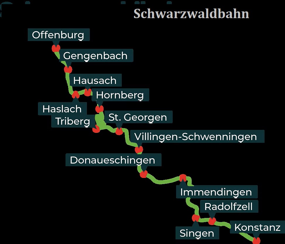✓ Kara Orman’dan geçen Schwarzwaldbahn tren hattı da Singen ve Konstanz güzergahlı olup hat Karlsruhe’den başlamaktadır.