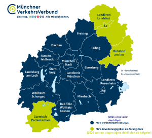 Rosenheim şehri, Landshut şehri ve Bad Tölz-Wolfratshausen, Dachau, Ebersberg, Erding, Garmisch-Partenkirchen, Freising, Fürstenfeldbruck, Landsberg am Lech, Landshut, Miesbach, Mühldorf Am Inn, München Land, Rosenheim Land, Starnberg, Weilheim-Schongau ve Kufstein dahil  diğer belediye ve ilçelerin eklenmesiyle, MVV/MVG bölgesinin toplu taşıma ulaşım alanı 1 Ocak 2026’dan itibaren yeni yıl içinde yaklaşık 13.600 km²’ ye ulaşacaktır. Bu demek olmaktadır ki ;  MVG/MVV  yaklaşık 4,15 milyon nüfusa sahip 410 belediye ve halka hizmet vermiş olacaktır.
