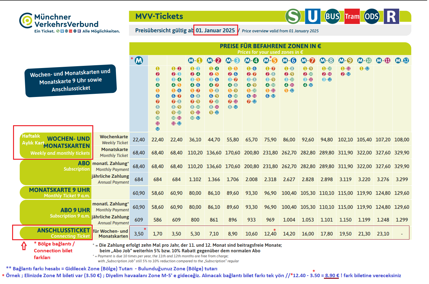 Misal, M bölgesine ait aylık biletiniz var ve 5. bölgedeki havaalanına gitmek istiyorsunuz. M bölgesine geçerli aylık biletiniz varsa, havaalanına tek seferlik yolculuğunuz için  bağlantı biletini (bilet makinesi yada MVV/MVG cep uygulamasından)  M bölgesi dışındaki 5 bölge için bağlantı biletini ALACAKSINIZ.