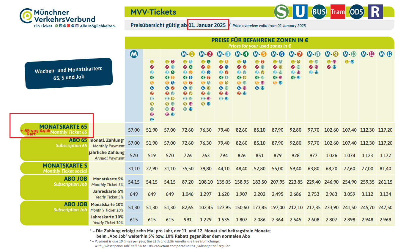 ** Sık seyahat edenlere özel fırsatlar – haftalık ve aylık biletler ile sağlanır (Turistler dahil). Alındığı günün hafta yada 1 ay sonrası ertesi gün saat 12.00′ e geçerlidir. Misal ; Salı günü aldığınız haftalık bilet sonraki hafta çarşamba günü saat 12.00′ e kadar bölgesinde geçerldir. Fiatlar ; 1-2-3…6 (tüm zone’lar) bölgeli olarak planlıdır. 2025 yılı için ; Zone M-1 / 1. bölge (Münih merkez dahi) = haftalık 22.40 € / aylık 68.40 € ; Zone M-6 / 6. bölge yani Münih merkezi dahil tüm bölgeler için ise bu tutarlar = 86 / 262.70 €’ dur. Bu biletlerin 1 aylık olarak 57 €’ luk daha uygun + 65 yaş indirimlisi de mevcuttur. +65 yaşa haftalık bilet bulunmuyor!. Ayrıca 1 yıllık bilet seçeneğiniz de mevcut. Günlük yada tüm günleri birine kartı vererek devredebilirsiniz (+ 65 yaş bileti hariç). Tüm araçlarda, gün boyu geçerli olduğu ulaşım bölgesinde (zone) sınırsız ulaşım imkanını sağlar. 65 yaş sonrası yanında ; genç tipi ya da sabah saat 09.00 sonrası kullanım imkanlı türleri de uygun fiyatlarla sunulmuştur. Bu biletlerin “grup tipi” – çok kişilik türü YOKTUR!. Satın alındığında geçerli olacağı başlangıç ve bitiş tarih dilimleri yazılı olacağından bu biletler “onam gerektirmez”. Satın alınmasında sıkıntı, protokol resmi bir belge tanzimi vs. gerekmez, ofislerden satın alındığında zorunluluk olacak ise (ki bu güne kadar görmedim!) gereğinde pasaportunuzu gösterirsiniz (+ 65 için belge gerekli). Bilet makinasından da aabilirsiniz. MVV bilet ücretlerine 2026 için yaklaşık % 3-5′ lik zam planlamıştır (aşağıya bakın).