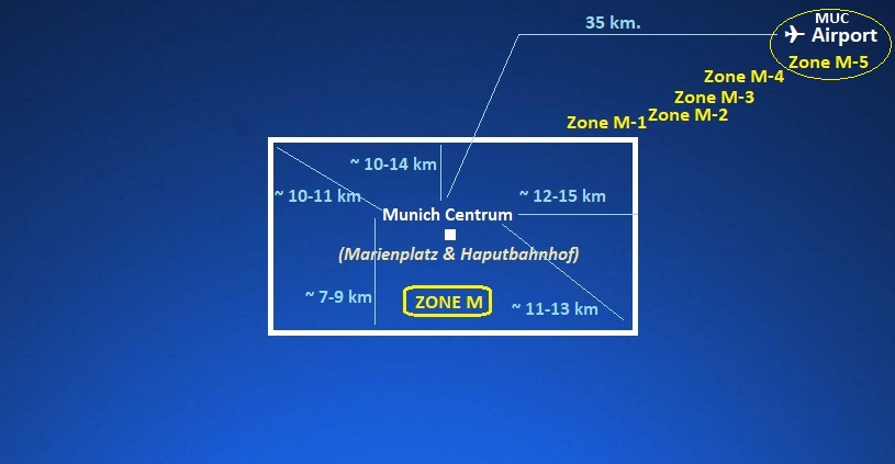 Münih  Merkezini (Centrum)  Zone M –  olarak haritalar isek ; Zone M bölgesinin durakları, “Marienplatz” gibi şehir merkezli konuma  yaklaşık 8-15 km. lik  mesafelerde bulunur.