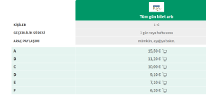 . 4 gezilik bilet – 4′ er Ticket ; 1 kişi için 4 gezi, 2 kişi için 2 gezi, 4 kişi için 1 gezi… 4 seyahatlik bilet, ara sıra seyahat edenler için idealdir . Dört seyahat mümkündür ve tüm dört seyahati kendiniz yapmanız, dört kişiyle tek bir seyahat yapmanız veya bileti bölerek iki kişinin ikişer kez seyahat etmesi tamamen size kalmıştır.