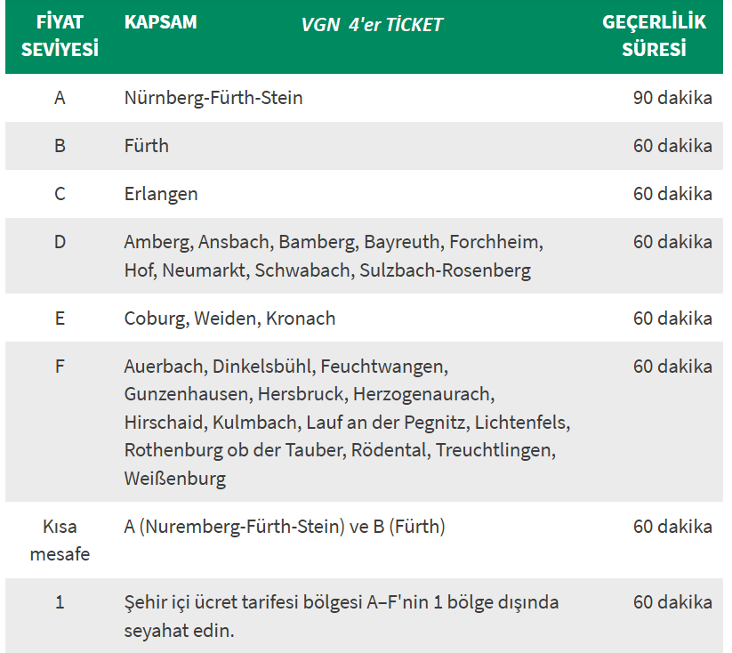 *4 seyahatlik bilet, Nürnberg, Fürth ve Stein’deki kısa mesafeler için A-F şehir içi tarifelerinde ve bölgedeki 1. tarife seviyesinde geçerlidir. 4 seyahatlik biletle tek yön seyahat, basılı ve mobil bilet olarak “normal” tek yön biletle aynı fiyata gelir .