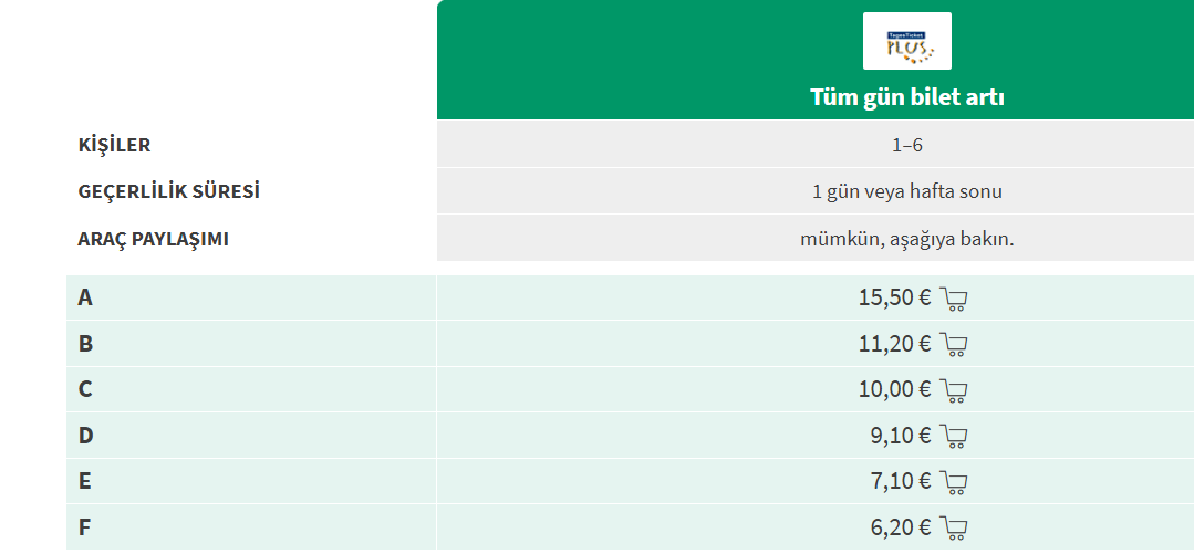 . All day ticket plus (»TagesTicket Plus«) // Tam Gün Bileti + (plus) ; 1-6 kişi – En fazla 5 ilave kişi (toplamda 18 yaş ve üzeri), günlük yada hafta sonu, devredilmez!, 1 kişiyerine = 1 bisiklet alınabilir, 1 köpek ücretsiz. Dikkat bu bilet ; 18 yaşından büyük 2 kişi (misal anne & baba) ve 17 yaş altı 4 çocuk olarak kullanım sağlıyor. 6 yaşına kadar tüm çocuklar bütün ulaşım araçlarında ücretsiz seyahat eder! Aynı biletin hafta sonunda Weekend Ticket olarak 2 gün geçerli türü de var.