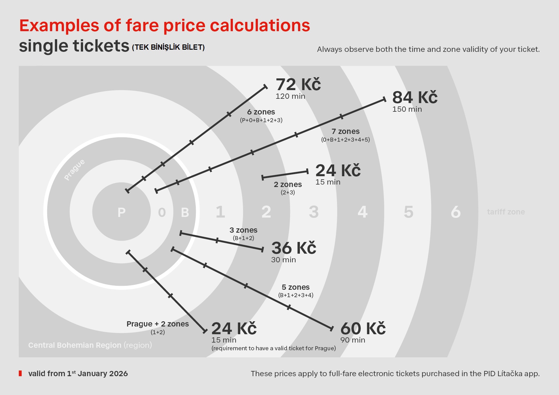 • Sadece Prag içinde seyahat ediyorsanız, Prag’ı tek tarifeli bir bölge olarak düşünebilirsiniz ve başka hiçbir şey için endişelenmenize gerek yoktur (Prag için bireysel ve abonelik seyahat belgelerinde geçerlidir).
