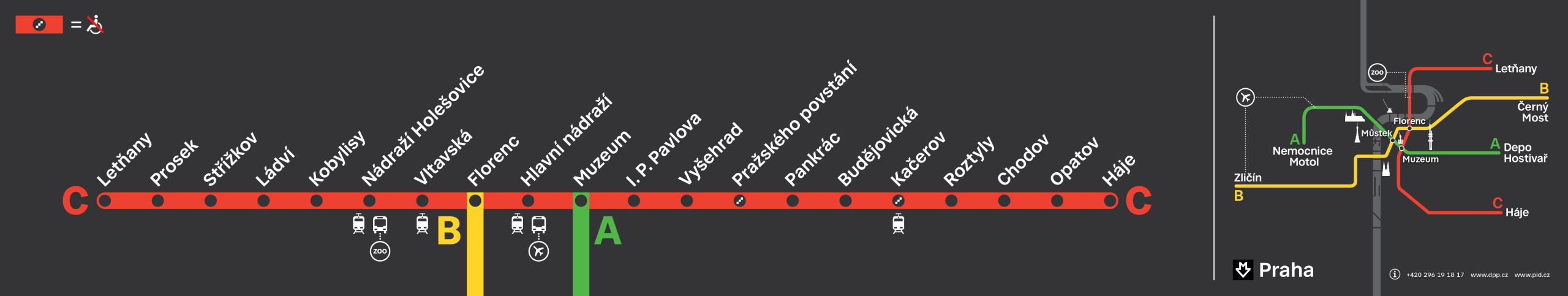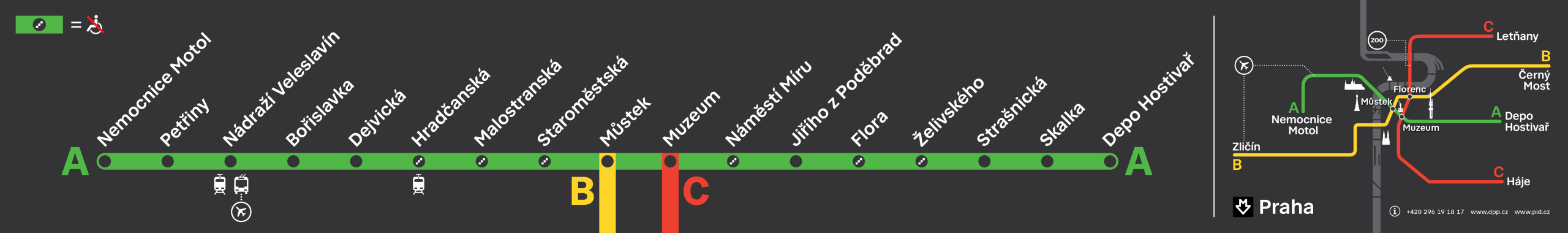 17 istasyondan ibarettir.  Prag hava alanı ile son durağı arasındaki otobüs bağlantılarıyla, şehir ulaşımının temel hattıdır. Toplam yol yaklaşık 30 dk. dolayıdır.