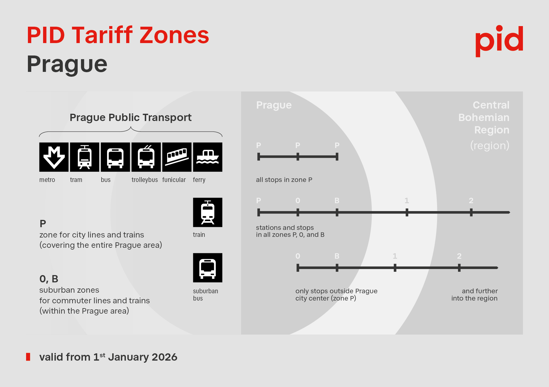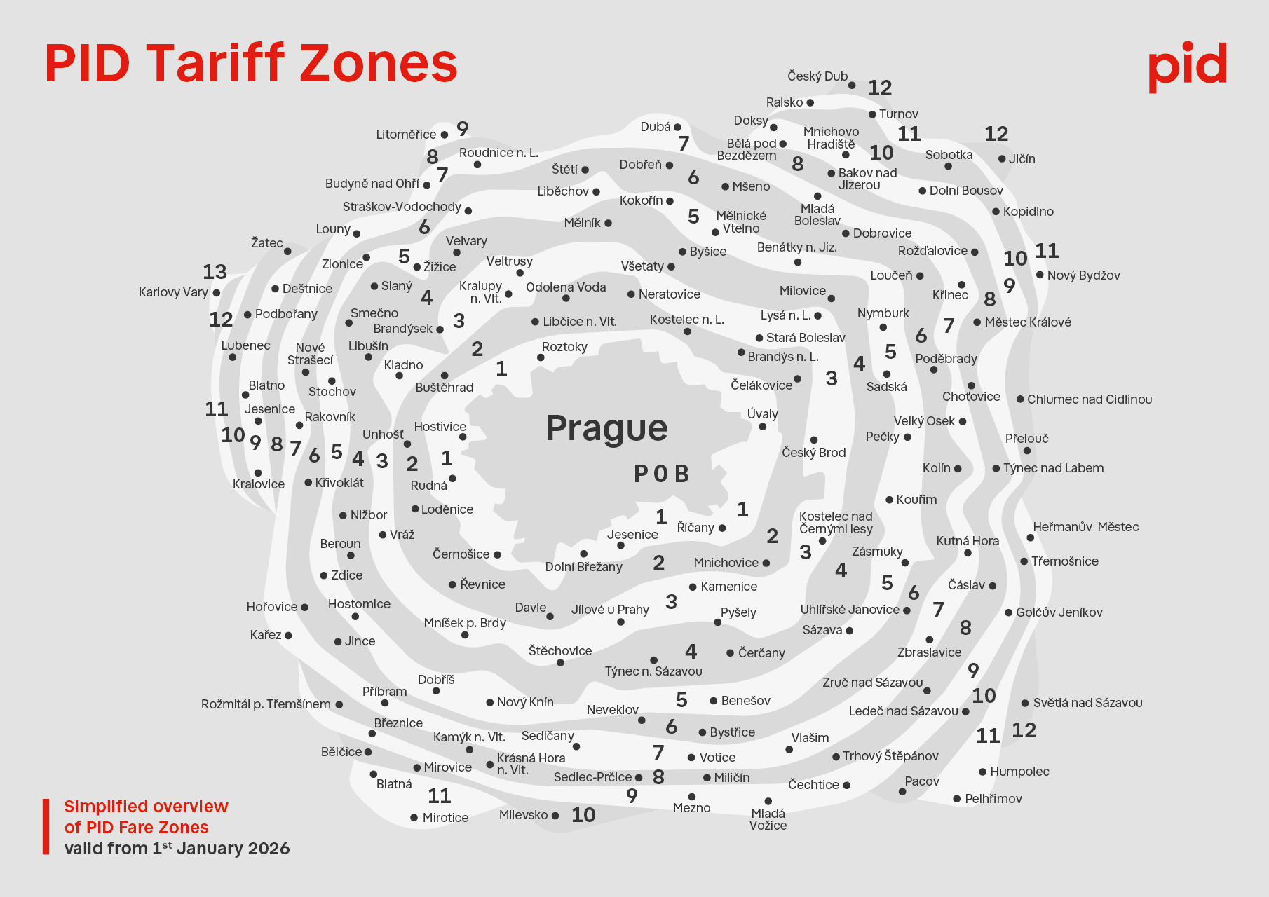 • Ancak, Prag (POB)  ile diğer bölgeler (1-13) arasında seyahat ederken, yani 300 ila 420 numaralı banliyö otobüs hatlarını veya Prag’dan veya Prag’a giden uzak bölge tren hatlarını kullanırken, Prag’ın bölgelere ayrılması önemlidir. Banliyö otobüs hatları, varış bölgeleri (B ve O bölgeleri) olarak adlandırılan bölgelere dahildir, tüm toplu taşıma hatları (metro, tramvaylar, şehir içi otobüsler ve troleybüsler, Petřín füniküleri ve feribotlar) ise P bölgesine aittir. P bölgesi, hem şehir içi hem de banliyö hatlarının hizmet verdiği duraklarda B ve 0 bölgeleriyle örtüşmektedir (örneğin, Zličín metro istasyonu P bölgesindedir, ancak banliyö hatları için aynı durak B bölgesindedir). Trenler için, Prag’daki istasyonlar P (merkez), O (geniş merkez) veya B (kenar mahalleler) bölgeleri olarak tanımlanabilir. PID ücret bölgeleri de  ardışık olarak sıralanır  : P, O, B, 1, 2, 3… 13 gibi.