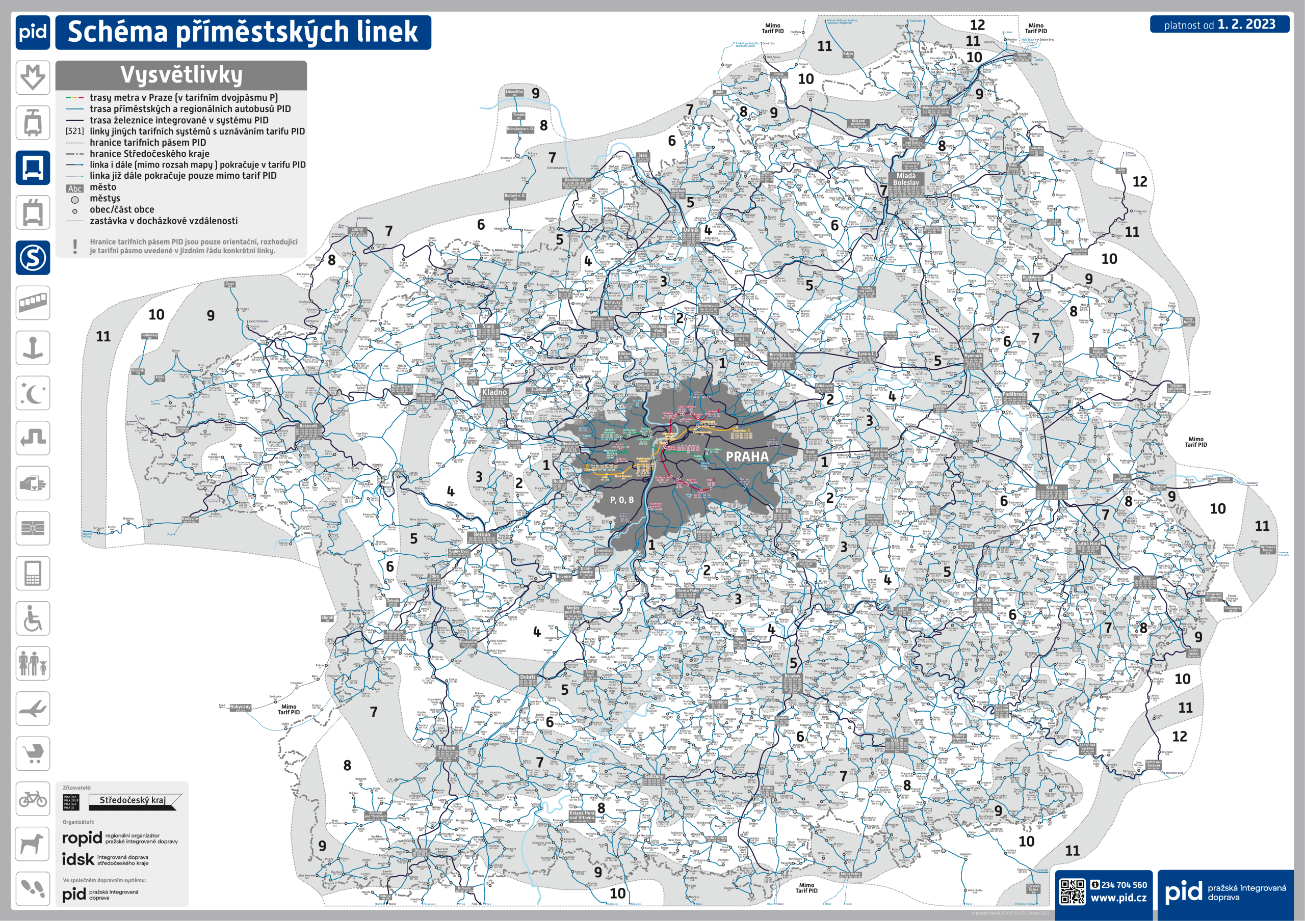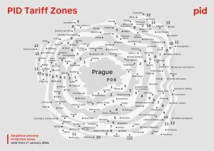 • Prag entegre ulaşımı, PID Tarifesi amaçları doğrultusunda ayrı tarife bölgelerine ayrılmıştır. Merkezi Prag’da  P, O ve B tarife bölgeleri bulunurken, Orta Bohemya Bölgesi’ nde (bundan sonra “Bölge” olarak da anılacaktır) tarife bölgeleri  1′ den başlayarak 13′ ye kadar numaralandırılır  ve Prag’ın etrafında eş merkezli hayali bir “ara halka” oluşturur.
