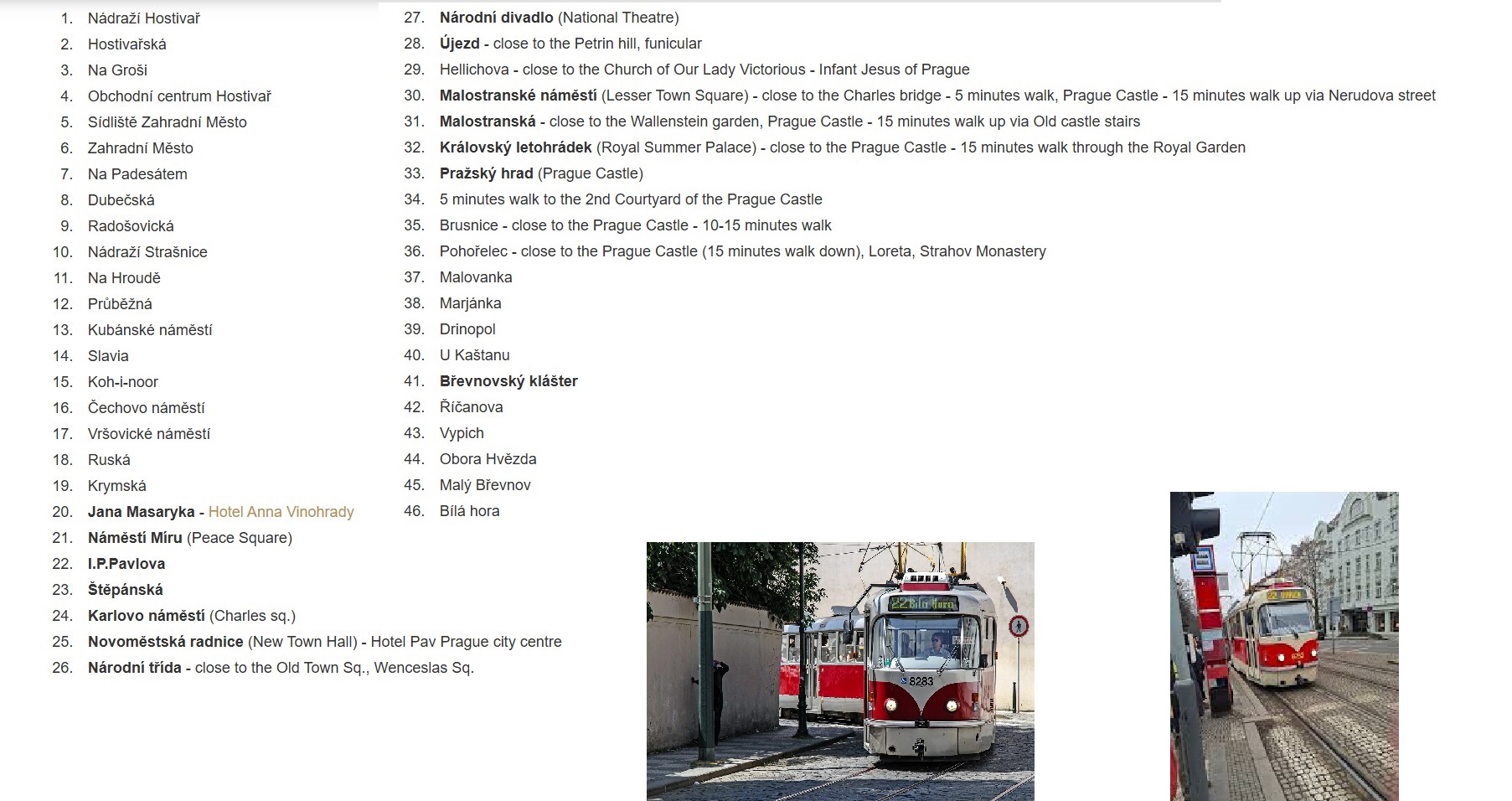 Vinohrady’deki Anna oteline yaklaşık 150 metre mesafede 22 numaralı tramvay hattının durağı bulunmaktadır (konum). Prag’ın merkezindeki Pav oteline ise yaklaşık 350 metre mesafede 22 numaralı tramvay hattının “Novoměstská radnice” durağı yer almaktadır (konum) .