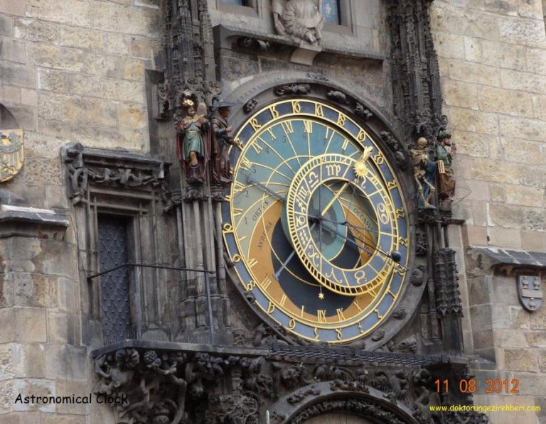 Tarihi bilgi : Saraya ilk saat 15. yy’ da yapılmıştır. Efsaneye göre saatçi Hanus’un bu şahaserin başka yerde yapılmaması amaçlı gözü kör edilmiştir. Saatin yapımcısı dünyayı evrenin merkezine oturtmuştur. Ona göre ay ile güneş dünya etrafında dönmektedir. Üzerinde güneşle ifade edilmiş olan ibresi, 3 farklı zamanı göstermektedir. Arap rakamlarından oluşan dış halka ; Eski Bohemya zamanını gösterir. Roma rakamlı halkada bilinen saattir. Saatin üst bölümü zodyak sembollerinin figür hareketleriyle gözlenirken, altta bir takvim vardır. Saatin en eski geçmişi 1410’ a dayanan parçaları mekanik saat kısmı ve astronomik kadrandır. Saatin cephesinin ve takvim kadranının yapıya 1490 yılları civarında eklendiği tahmin edilmektedir. Heykeller 17. Yüzyılda eklenmiş ve havariler 1865 ve 1866 yılları boyunca devam eden tamirat esnasında eklenmiştir.