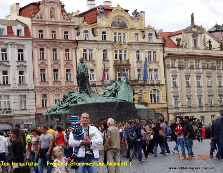 hakkında :Meydanın ortasında ülkenin ünlü rahibi, filozofu ve reformcusu 16. yy Protestan Hareketinin anahtar öncüsü Jan Hus’ un (Fakir bir aileden gelen Jan Huss, Lüksemburg kökenli Bohemya kralı iken Kutsal Roma German imparatoru olan IV. Charles’ ın (IV. Karl) kurduğu Karolinium Üniversitesi’nin rektörü olmuş ve Prag’da bulunan Beyt Lahem Kilisesinde halka verdiği vaazlarla bağnaz kilisenin halkı nasıl dolandırdığını halka anlatarak taraftar toplamıştır. Tyn Kilisesi de ayrı bir toplanma yerleri olmuştur. Bunun sonucu olarak ilk protestan kral da bu bölgeden çıkmıştır. 1414-1418 yıllarında bütün kilisenin katılımı ile büyük nifak meselesini halletmek üzere constance’da bir ruhani meclis toplandı.jan huss, papa tarafından kendisine güvence verildiği bilgisi ile bu meclise davet edildi, yakalandı ve delalet suçu ile yargılandı). 1414 yılında diri diri yakılarak öldürülmesinin ardından 6 Haziran 1915 yılında ölümünün 500. yılı anısına dikilen anıtı bulunuyor. Takipçileri 1420-1434 yılları arasında Hussite Savaşları veya Bohemian Savaşlarını olarak isimlemdirilen bir sonuca varmayacak savaşa neden olmuşlardı ( kaynak : mgonur.blogspot ).