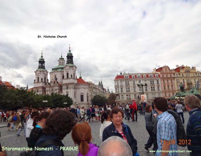 Saat kulesini geçince önümüzde kalan meydanın ortasında Jan Hus anıt heykeli, doğusunda Tyn kilisesi ve Rokoko yapılı Golz Kinsky Palace ile kuzey batısında da St. Nicholas Church (Barok Aziz Niklaus kilisesinin beyaz öncephesi dikkat çeker) bulunmaktadır.