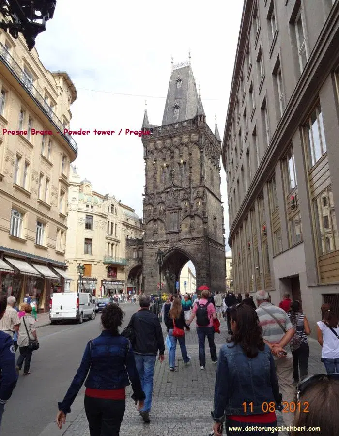 Powder Tower (Prašná brána) olarak da bilinen bu yapı Prag’ın 13 şehir kapısından biridir. İnşasına 1475 yılında II. Vladislav zamanında başlanmış. Ama daha sonra Kral’ın şehirden kaçmasıyla sonuçlanan isyan yüzünden 8 yıl boyuca durduruldu. 1870′ lerde Josef Mocker’a kalan inşaatı tamamlaması istendiğinde hala bir çatısı yoktu. Kapıya mevcut ismi, 17. yüzyılda silah tozu olan barutların saklanmaya başlanmasıyla verilmiştir. Bu süre öncesinde görevi merasimlerle ilgiliydi : taç giydirme törenleri Aziz Vitus’un Cathedral’ ine taşınmadan önce burada başlardı. 17. yüzyılda barut deposu olarak kullanılan bu kule 44 metre yüksekliğindedir. İçerisindeki 186 basamağı tırmanarak Old Town manzarasının tadını çıkarabilirsiniz.