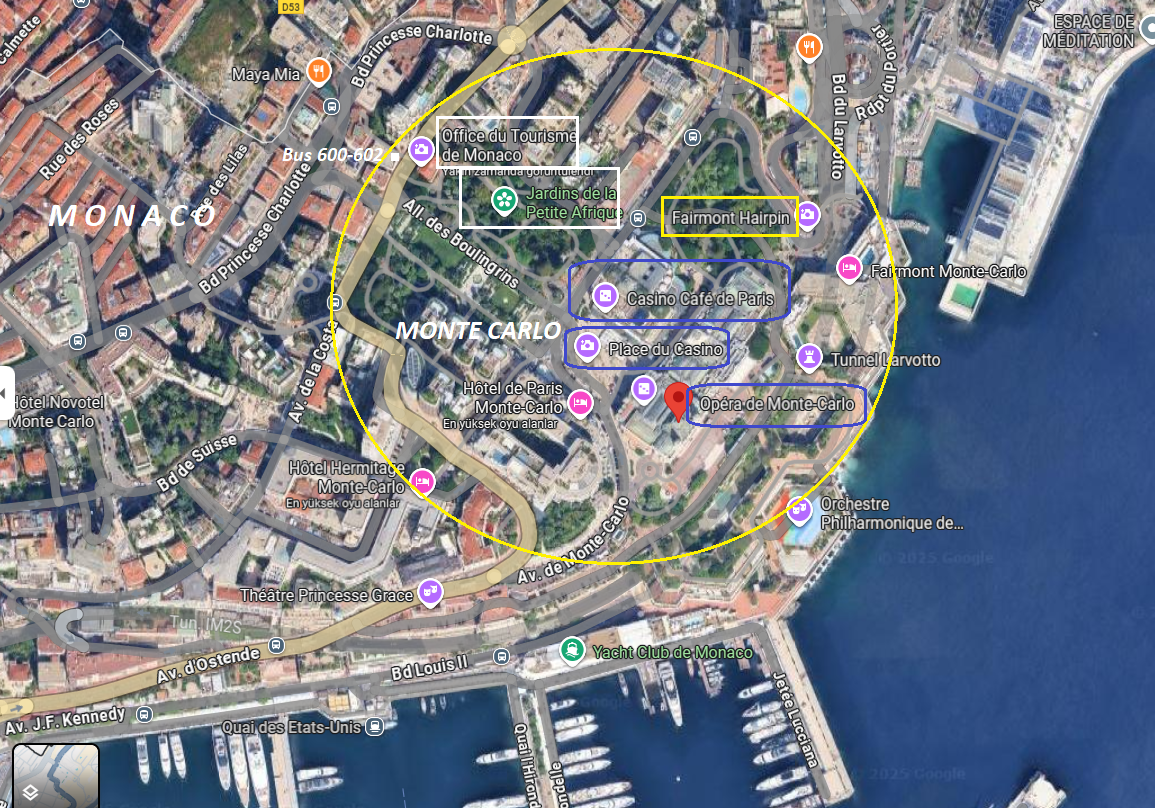Operanın önünden geçerek aşağıya iniyoruz. Kompleks opera bina köşesinden bu alanın 2. park alanına “Le Parc Spélugues” geçerek aşağıya bakınca keskin virajlı bir yol gözükecektir (Fairmont Hairpinkonum).