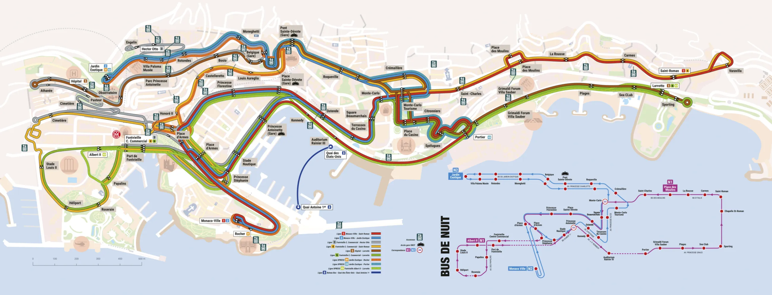 . Hat 1 : Monaco-Ville (le Rocher) – Saint-Roman (gidiş-dönüş): Prens Sarayı , Katedral , Monako Oşinografi Müzesi , Place d’Armes, Port Hercule, Mareterra bölgesi, Japon Bahçesi , Beaumarchais Meydanı, Place du Casino ve Turizm Ofisi’ne hizmet verir.