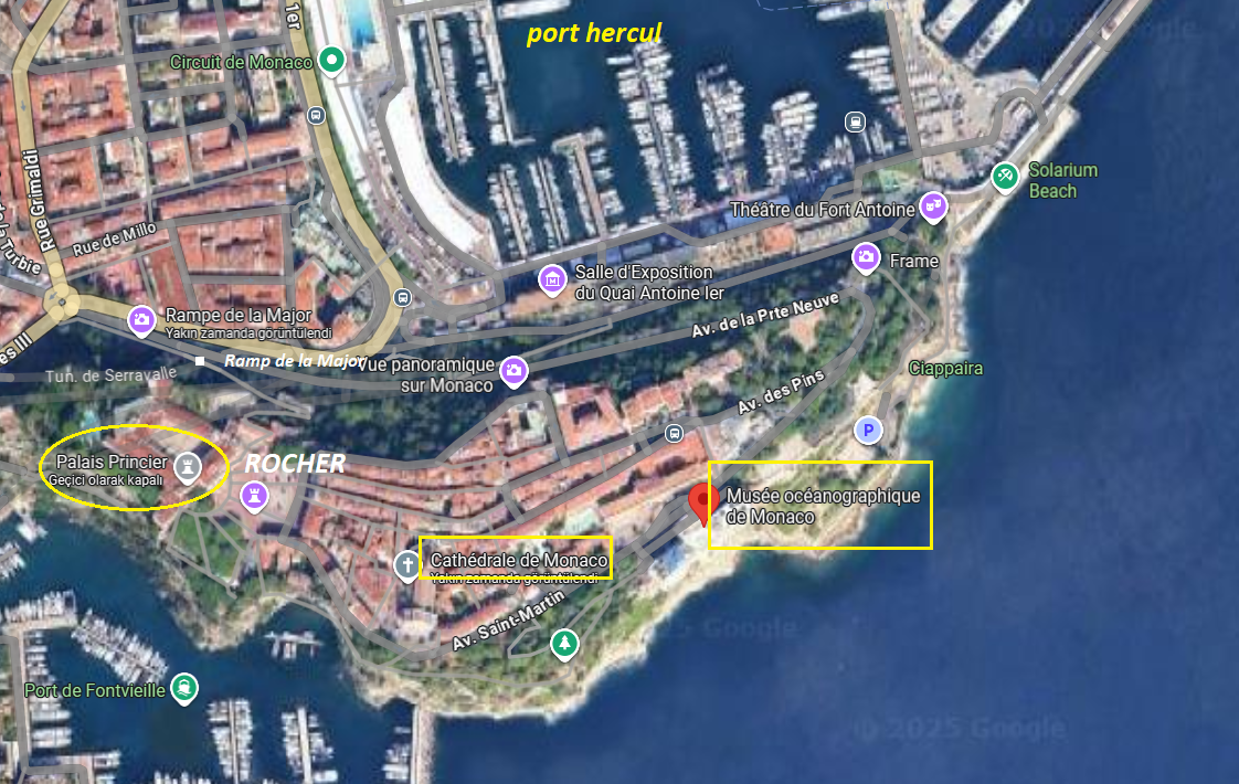 Katedral’ den görülen sahilde yer alan ve denize doğru uzanan muhteşem yapı, 20. yüzyılın başlarında dünya çapında birçok keşfe öncülük eden ve doğa bilimlerinde önemli ilerlemeler kaydeden  “Musée océanographique de Monaco” – Oşinografi müzesidir ve Prens I. Albert’e adanmıştır.