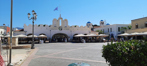 Meydan’ da yakın konumda, tepesi mavi renkli kubbeler içeren yapı da Agia Paraskevi Kilisesi’ dir. 2017 depreminden o da ciddi hasar almıştır (alt resim). Bej-mavi tonlardaki sade ve göz alıcı dış görünümü ve zengin iç dekorasyonu ile tipik bir Yunan Ortodoks kilisesidir.